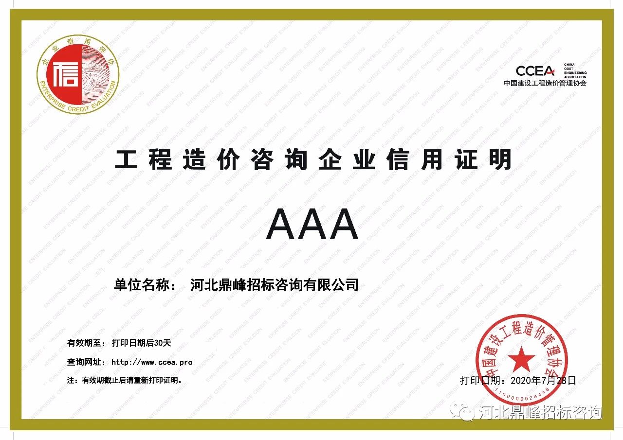 近日,中國建設工程造價管理協(xié)會在其官網(wǎng)公布了“2020年第二批工程造價咨詢企業(yè)信用評價”結(jié)果。河北鼎峰招標咨詢有限公司憑借優(yōu)秀的造價成果和業(yè)務素質(zhì),在本次工程造價咨詢企業(yè)信用評價中榮獲AAA等級,向客戶和公眾展現(xiàn)了卓越的企業(yè)綜合實力。
