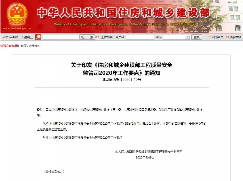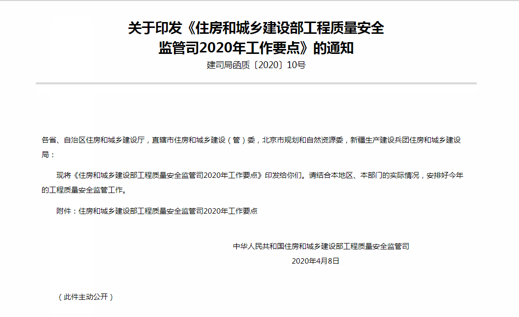 剛剛,住建部印發(fā)《住房和城鄉(xiāng)建設(shè)部工程質(zhì)量安全監(jiān)管司2020年工作要點》的通知,明確指出: